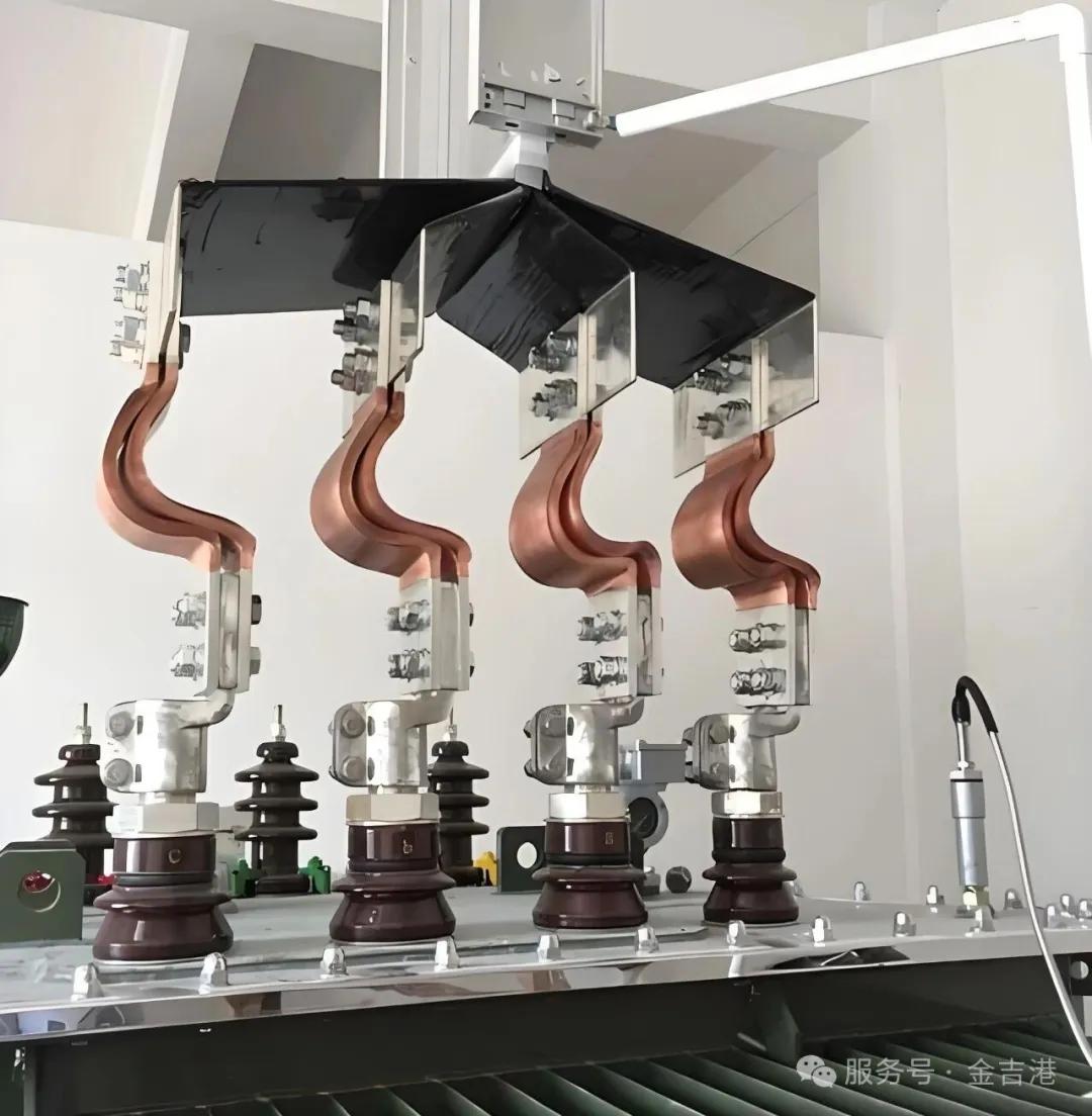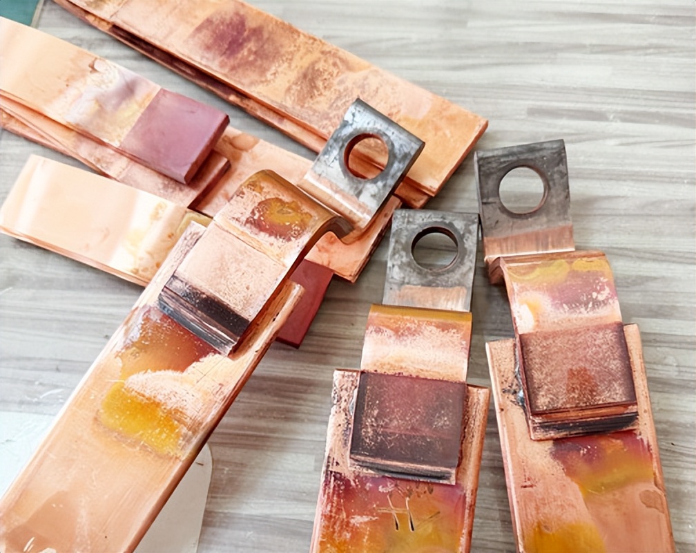金吉港高分子扩散焊机可焊接软铜排、软铝排、铜箔软连接、铝箔软连接、铜铝软排贴镍片、铝板贴镍片、编织带软连接、铜绞线软连接、软条编织带、硬铜排连接、硬铝排连接、铜排铝排搭接、铜软连接和硬铜排搭接等金属制品。